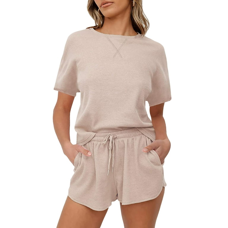 Women S Waffle Knit Pajama Set Short Sleeve Top And Shorts Casual Solid Color With Pockets Walmart Com